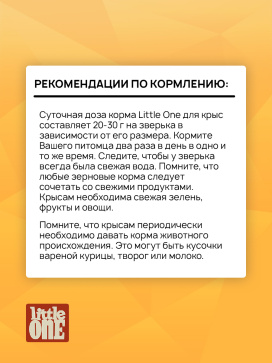 Little One корм для крыс содержит полный комплекс белков, жиров, углеводов, минеральных веществ и витаминов, необходимых для полноценного питания и здоровья вашего питомца.