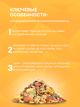 Ассортимент бренда состоит из самых востребованных позиций и включает в себя не только продукты для питания и ухода за животными, но и различные лакомства, цель которых – разнообразить рацион и наладить эмоциональную связь между питомцем и его владельцем.