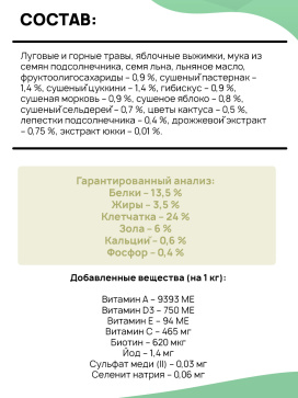 Луговые и горные травы, яблочные выжимки, мука из семян подсолнечника, семя
