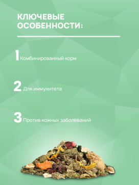 Для разнообразия рациона шиншиллы в состав корма входят вкусные и полезные добавки – сушеные цветы, фрукты, овощи и ягоды. Корм не содержит зерновых компонентов, что прекрасно подходит для диетического питания животных, в том числе страдающих от избыточного веса и других заболеваний.
