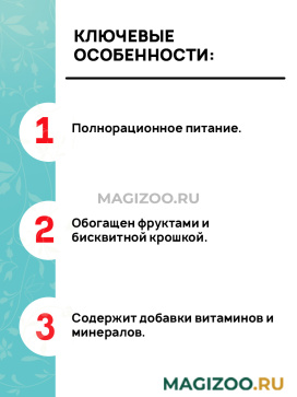 Корм обогащен фруктами и бисквитной крошкой. Обеспечит сбалансированную и разнообразную диету.