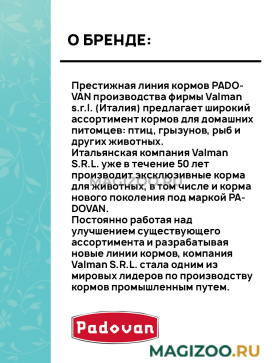 Информация о составе и ингредиентах, цветовом решении, технических и иных характеристиках, стране-изготовителе, внешнем виде и комплекте поставки товара носит справочный характер и основана на последних доступных к моменту публикации сведениях. Доставка данного товара осуществляется во все регионы РФ.Итальянская компания Valman S.R.L. уже в течение 50 лет производит эксклюзивные корма для животных, в том числе и корма нового поколения под маркой PADOVAN.