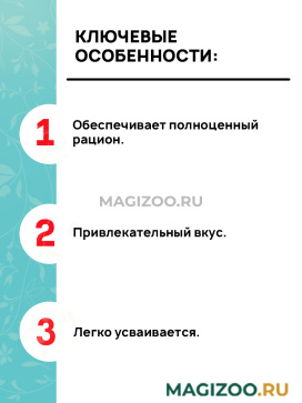 Корм обогащен всеми необходимыми витаминами и минералами для здорового роста и развития Вашего питомца.