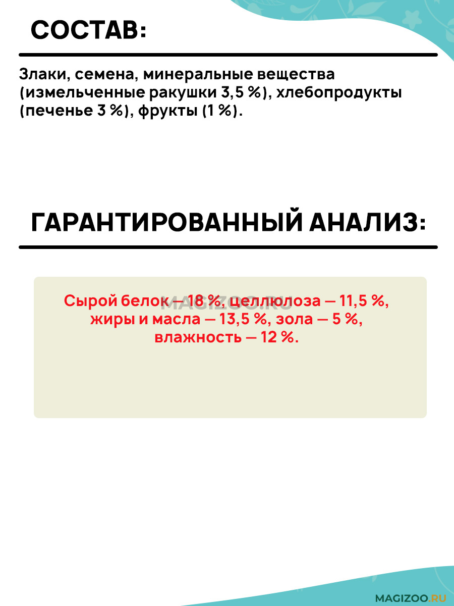 Злаки, семена, минеральные вещества (измельченные ракушки 3,5 %), хлебопродукты (печенье 3 %), фрукты (1 %).