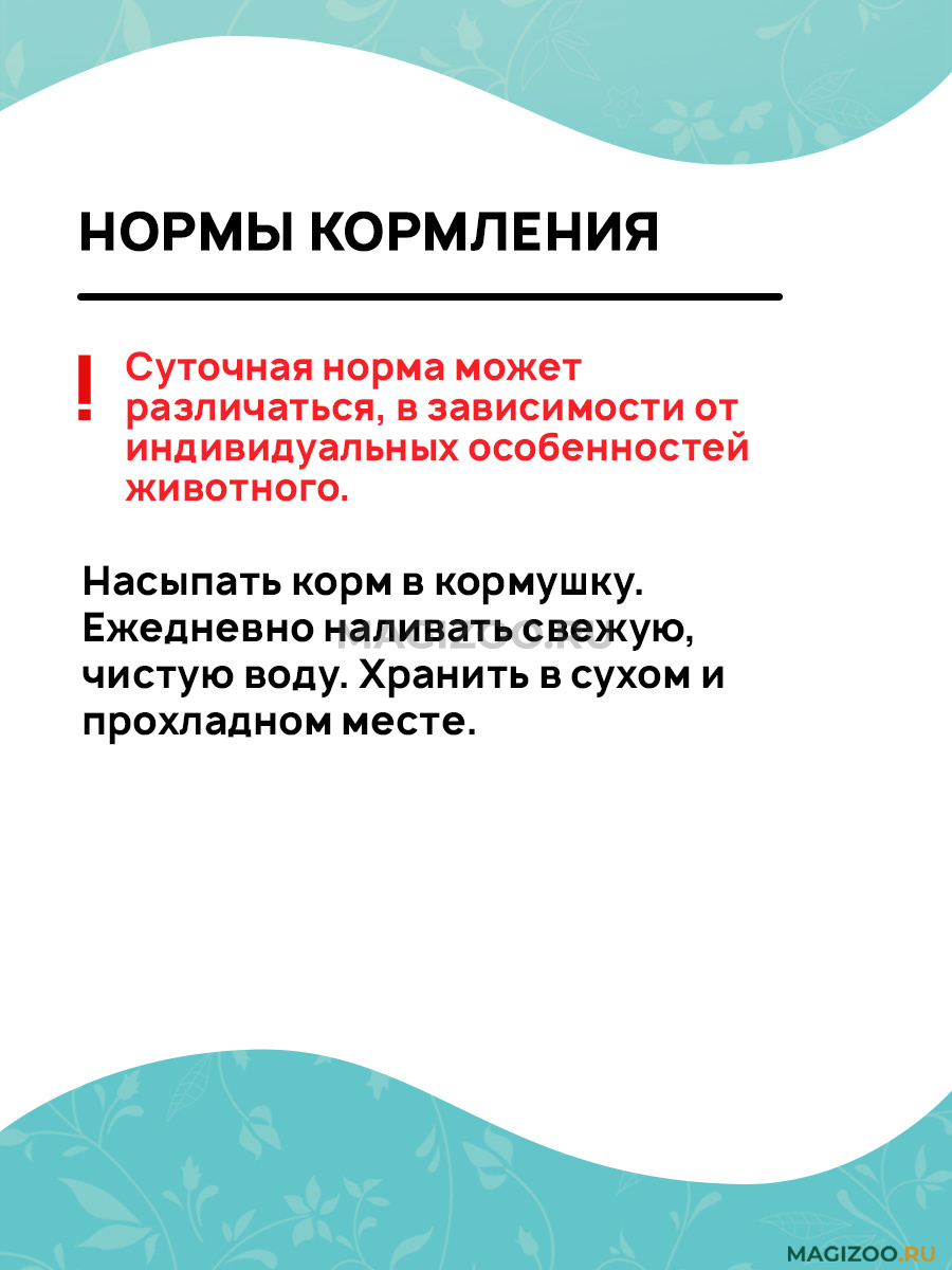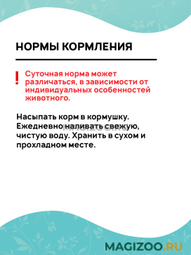Насыпать корм в кормушку. Ежедневно наливать свежую, чистую воду. Хранить в сухом и прохладном месте.