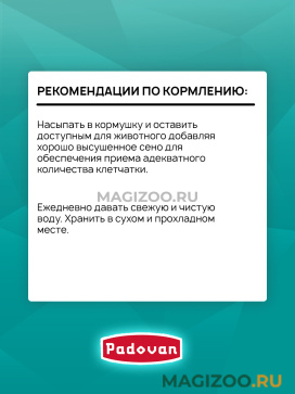 Рекомендации по кормлению: Насыпать в кормушку и оставить доступным для животного добавляя хорошо высушенное сено для обеспечения приема адекватного количества клетчатки. Ежедневно давать свежую и чистую воду. Хранить в сухом и прохладном месте.