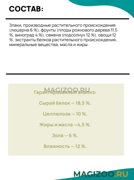 Состав: Злаки, производные растительного происхождения (люцерна 6 %), фрукты (плоды рожкового дерева 11,5 %, виноград 4 %), семена (подсолнух 12 %), овощи 12 %, экстракты белков растительного происхождения, минеральные вещества, масла и жиры.