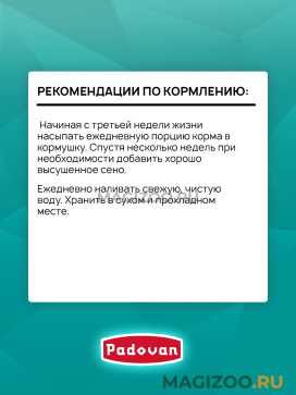 Рекомендации по кормлению: Начиная с третьей недели жизни насыпать ежедневную порцию корма в кормушку. Спустя несколько недель при необходимости добавить хорошо высушенное сено. Ежедневно наливать свежую, чистую воду. Хранить в сухом и прохладном месте.