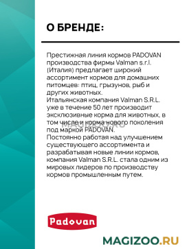 Информация о составе и ингредиентах, цветовом решении, технических и иных характеристиках, стране-изготовителе, внешнем виде и комплекте поставки товара носит справочный характер и основана на последних доступных к моменту публикации сведениях. Доставка данного товара осуществляется во все регионы РФ.Итальянская компания Valman S.R.L. уже в течение 50 лет производит эксклюзивные корма для животных, в том числе и корма нового поколения под маркой PADOVAN.