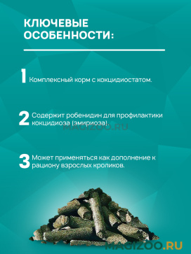 Комплексный корм с кокцидиостатом для молодых декоративных кроликов и кроликов карликовых пород. Содержит робенидин для профилактики кокцидиоза (эмириоза) кроликов.