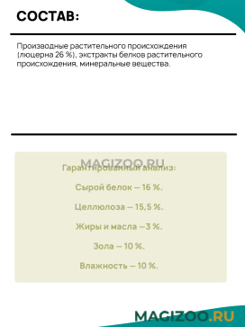 Состав: Производные растительного происхождения (люцерна 26 %), экстракты белков растительного происхождения, минеральные вещества.