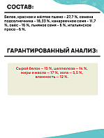 Белое, красное и жёлтое пшено – 27,7 %, семена подсолнечника – 18,33 %, канареечное семя – 11,7 %, овёс – 16 %, льняное семя – 6 %, итальянское просо – 6 %.