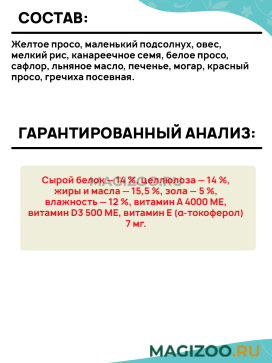 Обеспечивает средних попугаев всеми необходимыми питательными веществами в течение всего года.