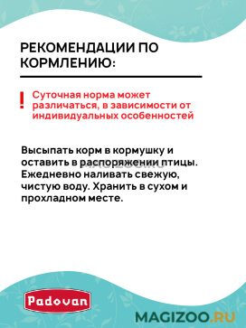 Высыпать корм в кормушку и оставить в распоряжении птицы. Ежедневно наливать свежую, чистую воду. Хранить в сухом и прохладном месте.