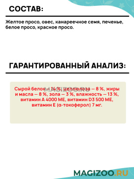 Обеспечивает волнистых попугаев всеми необходимыми питательными веществами в течение всего года.
