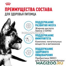 Благодаря сочетанию пребиотиков (МОС) и легкоусвояемых белков, формула ROYAL CANIN® Maxi Puppy поддерживает баланс микрофлоры кишечника, способствуя здоровому пищеварению.