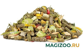 Корм состоит из травяных гранул, плющеных зерен, сушеных овощей, сушеной люцерны и плодов рожкового дерева, а кусочки сушеного яблочка делают корм не только полезным, но и очень вкусным!
