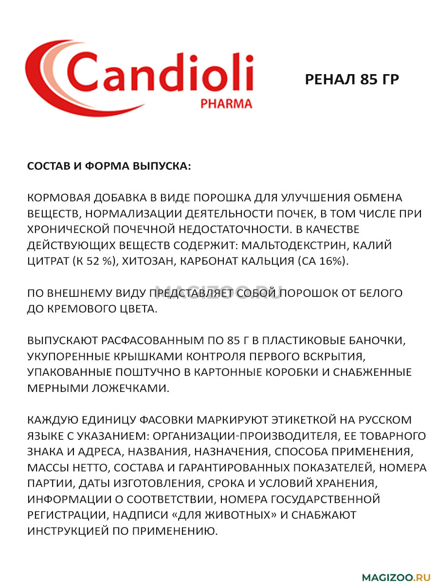 Добавка кормовая Ренал благодаря наличию входящих в его состав компонентов в оптимальном сочетании поддерживает функцию почек как на ранней, так и на поздней стадии хронической почечной недостаточности, нормализует обменные процессы в организме животных, возникающие при хронической почечной недостаточности.
