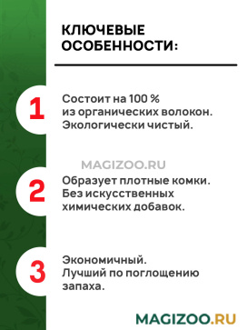 - Лучший по поглощению запаха. Неприятный запах эффективно и в течение продолжительного времени связывается в капиллярной системе растительных волокон без добавления химических веществ или ароматизаторов. Кошки любят естественный, свежий запах растительных волокон. Сделайте приятное себе и своей кошке!