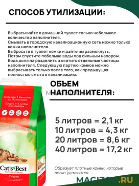 Cat's Best производится из естественных растительных волокон, которые, как и туалетная бумага, растворяются уже в туалете, поэтому свободно можно выбрасывать эти отходы в туалет и смывать достаточным количеством воды.