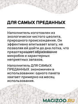 Наполнитель изготовлен из экологически чистого цеолита, природного происхождения. Он эффективно впитывает влагу, не позволяя ей дойти до дна лотка, что предотвращает образование микробов и характерных неприятных запахов.