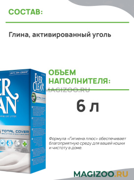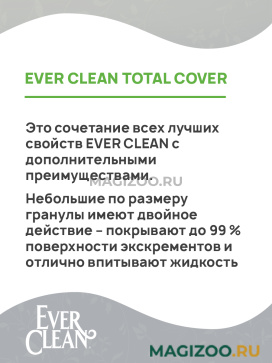 EVER CLEAN TOTAL COVER – это сочетание всех лучших свойств EVER CLEAN c дополнительными преимуществами. Небольшие по размеру гранулы имеют двойное действие – покрывают до 99 % поверхности экскрементов и отлично впитывают жидкость.