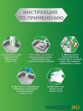 Наполните туалет гранулами Ever Clean слоем не менее 5 — 8 см. На обычный туалет в среднем требуется 3,2 кг наполнителя. Ежедневно доставайте совком образовавшиеся комки и выбрасывайте их в мусорное ведро. Таким образом, наполнитель всегда остается чистым и готовым к использованию. Для того, чтобы восполнить содержимое туалета, не нужно менять весь наполнитель, добавляйте лишь необходимое количество Ever Clean. Следите за тем, чтобы толщина слоя наполнителя всегда составляла не менее 5 см.