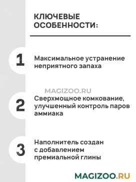 Быстро впитывает жидкость, образует крепкие комки и блокирует неприятные запахи.