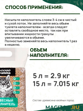Наполнитель GAMMA изготовлен из экологически чистой прессованной древесины хвойных пород и не содержит посторонних примесей. Гранулы эффективно поглощают влагу, оставляя в помещении легкий аромат хвои.