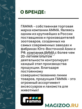 ГАММА – собственная торговая марка компании AMMA. Являясь одним из крупнейших в России поставщиков и производителей зоотоваров, созданных на самых современных заводах и фабриках Юго-Восточной Азии и РФ, компания AMMA с более чем 20-летним опытом деятельности контролирует каждый этап производства продукции. Благодаря постоянному совершенствованию линии товаров, продукция ГАММА – это огромный ассортимент аксессуаров и лакомств для животных!