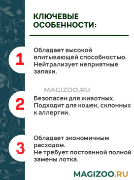 Наполнитель изготовлен из натуральных глин и обладает бактерицидными свойствами. Он абсолютно безопасен и прекрасно подойдет для животных-аллергиков.