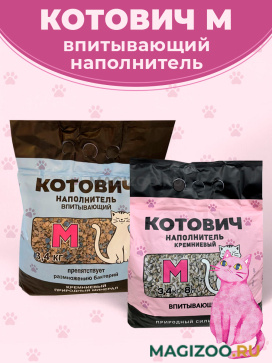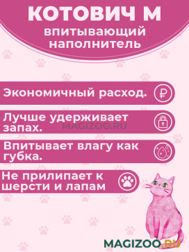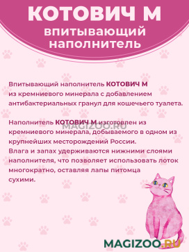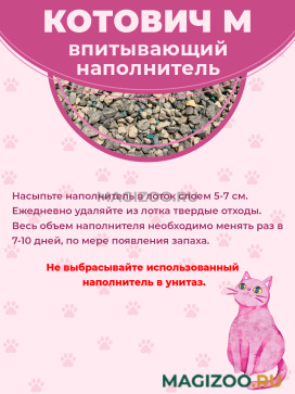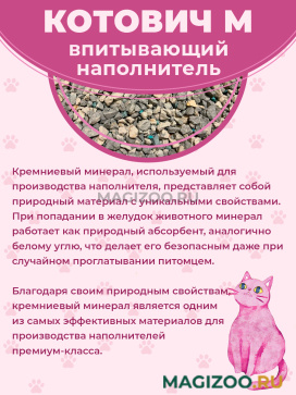 Впитывающий наполнитель КОТОВИЧ М из кремниевого минерала с добавлением антибактериальных гранул для кошечьего туалета.