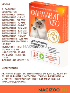 В 1 таблетке содержится: Витамин А - 700 МЕ Витамин D3 - 35 МЕ Витамин Е - 700 мкг Витамин В1 - 70 мкг Витамин В2 - 70 мкг Витамин В3 - 525 мкг Витамин В5 - 525 мкг Витамин В6 - 52,5 мкг Витамин Вс - 35 мкг Витамин В12 - 0,35 мкг Витамин Н (биотин) - 1,75 мкг Метионин - 14 мг Таурин - 3,5 мг L-карнитин - 21 мкг Кальций - не менее 17,5 % Фосфор - не менее 11 %.
