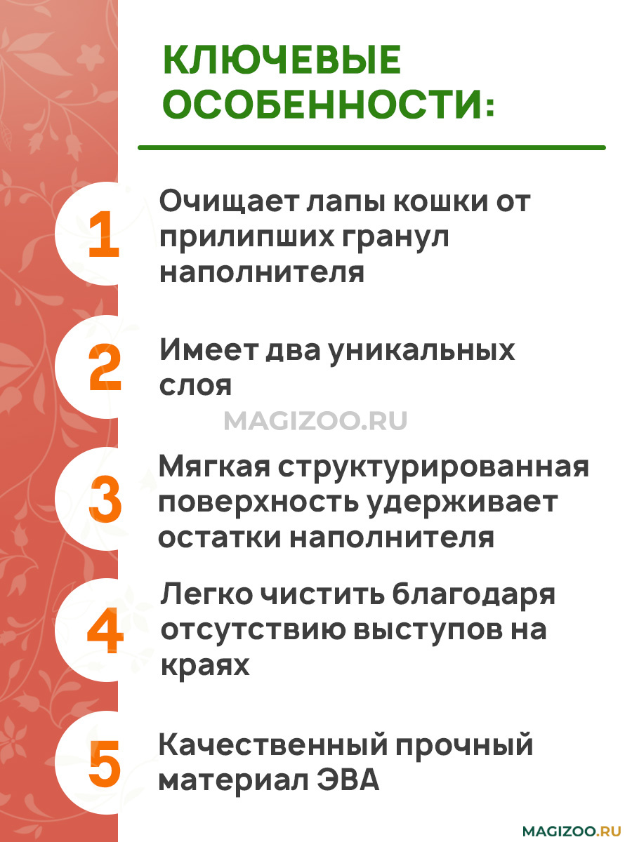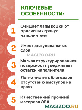 - Очищает лапы кошки от прилипших гранул наполнителя.