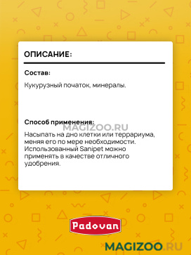 Насыпать на дно клетки или террариума, меняя его по мере необходимости. Использованный Sanipet можно применять в качестве отличного удобрения.