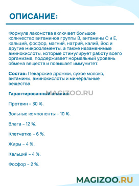 Необходимая добавка к ежедневному питанию грызунов с повышенным содержанием биотина и витамина С, которая сочетает в себе и великолепный вкус, что позволяет использовать ее для поощрения, и необходимый для здоровья комплекс витаминов.