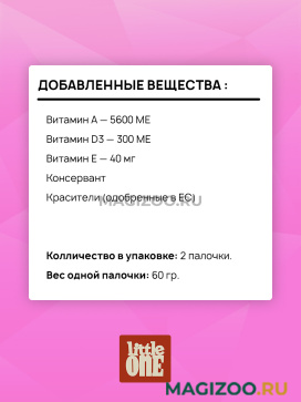 Информация о составе и ингредиентах, цветовом решении, технических и иных характеристиках, стране-изготовителе, внешнем виде и комплекте поставки товара носит справочный характер и основана на последних доступных к моменту публикации сведениях. Доставка данного товара осуществляется во все регионы РФ.Продукция бренда Little One – это 100% натуральные продукты питания и товары для ухода за декоративными животными, которые разработаны с учетом индивидуальных особенностей, пищевых потребностей и вкусовых предпочтений питомцев.