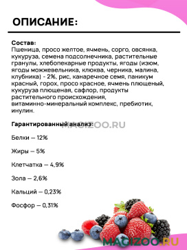 Пшеница, просо желтое, ячмень, сорго, овсянка, кукуруза, семена подсолнечника, растительные гранулы, хлебопекарные продукты, ягоды (изюм, ягоды можжевельника, клюква, черника, малина, клубника) - 2%, рис, канаречное семя, паникум красный, горох, просо красное, ячмень плющеный, кукуруза плющеная, сафлор, продукты растительного происхождения, витаминно-минеральный комплекс, пребиотик, инулин.
