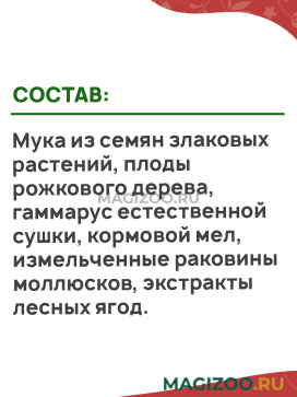 Состав: мука из семян злаковых растений, плоды рожкового дерева, гаммарус естественной сушки, кормовой мел, измельченные раковины моллюсков, экстракты лесных ягод.