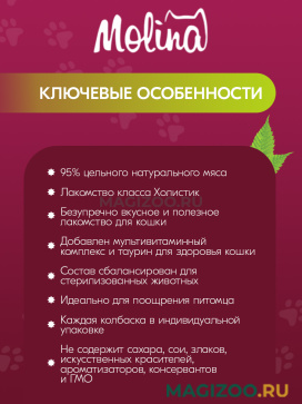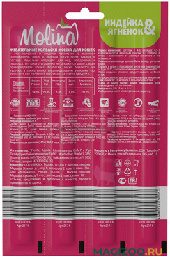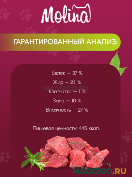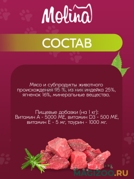 • ингредиенты, входящие в состав корма Molina, сертифицированы как пригодные для питания человека и производятся на территории ЕС.