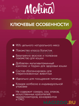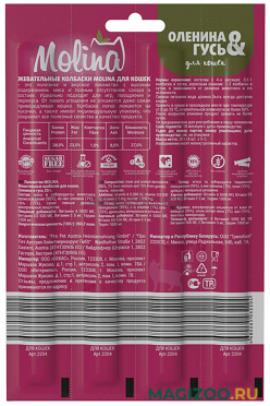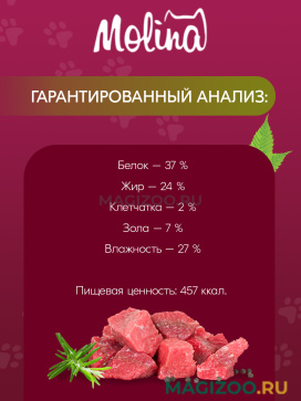• ингредиенты, входящие в состав корма Molina, сертифицированы как пригодные для питания человека и производятся на территории ЕС.