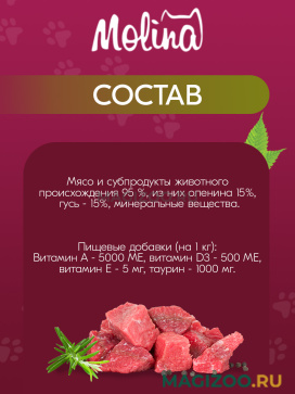 Состав: Мясо и субпродукты животного происхождения 95 %, из них оленина 15%, гусь - 15%, минеральные вещества.