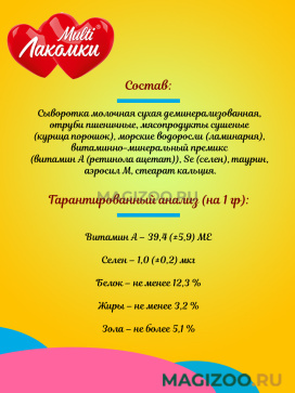 Мы ежедневно заботимся о себе, но порой забываем о здоровье своих питомцев. А ведь поддержание здоровья для них очень важно, так как от этого зависит общее состояние организма животного. Витаминное лакомство MultiЛакомки – кормовая добавка, созданная с учетом потребностей Вашего питомца, для улучшения и поддержания его здоровья.
