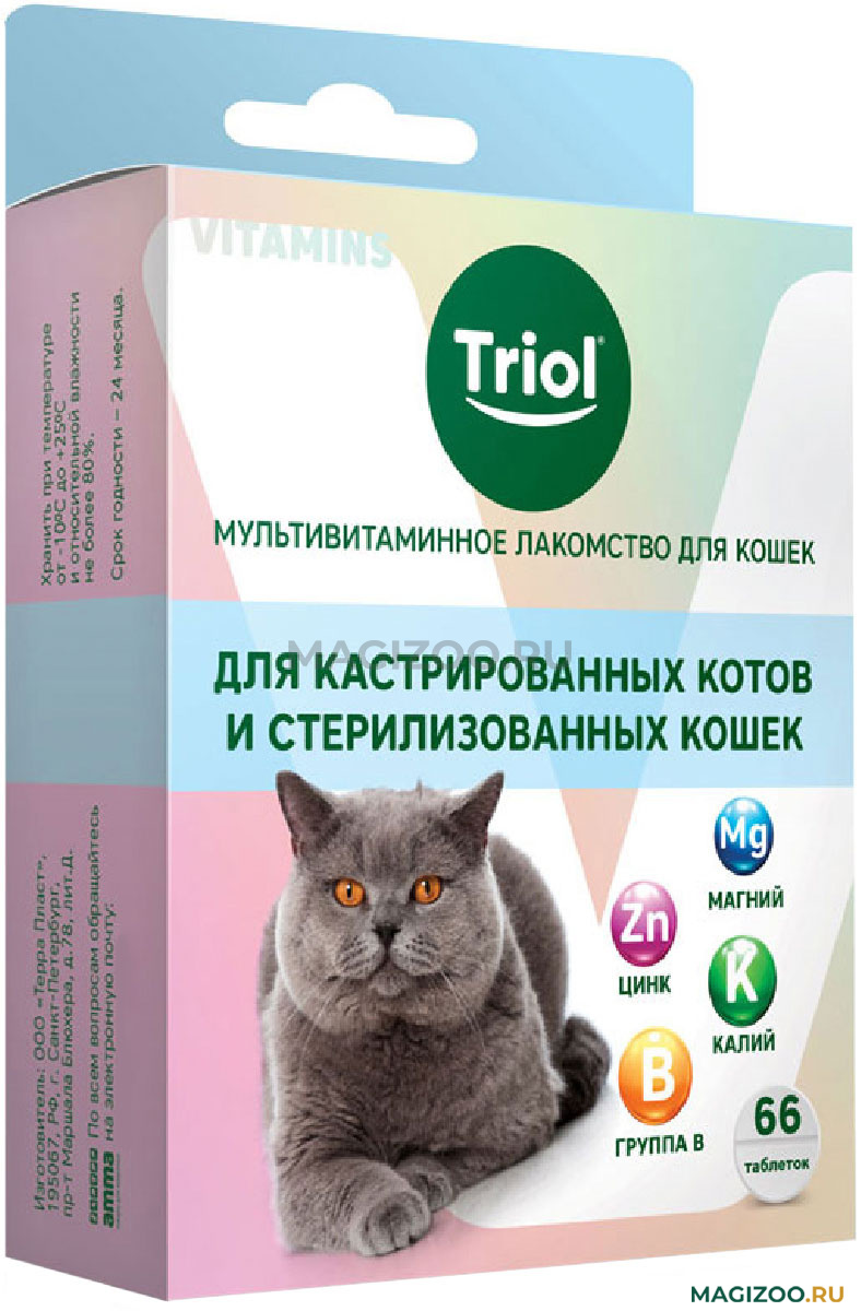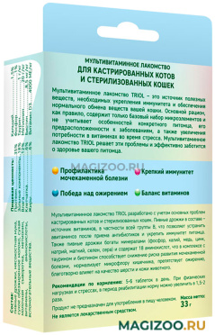 Мультивитаминное лакомство TRIOL разработано с учетом основных проблем кастрированных котов и стерилизованных кошек.