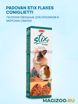 Рассыпчатые запеченные палочки с хлопьями овощей, дополнительное питание к обычному рациону животных. Подходит для питания взрослых декоративных кроликов, морских свинок и шиншилл.