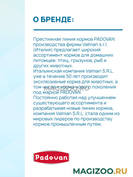 Престижная линия кормов PADOVAN производства фирмы Valman s.r.l. (Италия) предлагает широкий ассортимент кормов для домашних питомцев: птиц, грызунов, рыб и других животных.