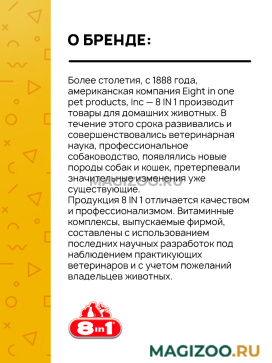 Информация о составе и ингредиентах, цветовом решении, технических и иных характеристиках, стране-изготовителе, внешнем виде и комплекте поставки товара носит справочный характер и основана на последних доступных к моменту публикации сведениях. Доставка данного товара осуществляется во все регионы РФ.Продукция 8 IN 1 отличается качеством и профессионализмом. Витаминные комплексы, выпускаемые фирмой, составлены с использованием последних научных разработок под наблюдением практикующих ветеринаров и с учетом пожеланий владельцев животных.
