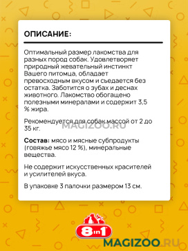Косточка 8 в 1 – это запатентованная формула для жевания и удовольствия, 3,5 % жира и более 80 % белка. Всего один источник протеина (говядина): особенно хорошо подходит для чувствительных собак с пищевой непереносимостью или аллергией. Полезно для зубов. Удовлетворяет естественный инстинкт собаки в жевании. Без искусственных усилителей аромата. Долго жуется, съедается без остатка. Оптимальный размер лакомства для разных пород собак. Удовлетворяет природный жевательный инстинкт Вашего питомца, обладает превосходным вкусом и съедается без остатка. Заботится о зубах и деснах животного. Лакомство обогащено полезными минералами и содержит 3,5 % жира.