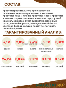 Состав: продукты растительного происхождения, различные виды сахара, молоко и молочные продукты, яйца и яичные продукты, мясо и продукты животного происхождения, минералы, кукурузный крахмал, сахароза, сухая сыворотка, молочный сахар, яичный порошок, легкоусвояемый белок, костяной фосфат, кальция лактат пентагидрат, сырный порошок.