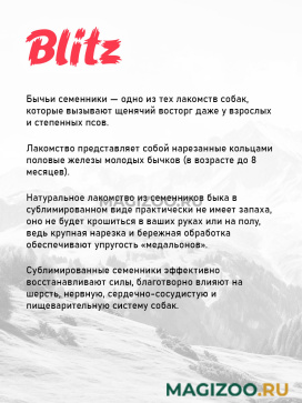 Вкусное и полностью натуральное лакомство BLITZ семеники доставит вашей собаке настоящее наслаждение. Для его изготовления использована технология сублимации, которая считается золотым стандартом консервации.